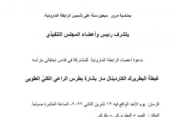 دعوة للمشاركة بقداس ذكرى السبعين لتأسيس الرابطة المارونية، الأحد 13 تشرين الثاني 2022 – الساعة العاشرة- بكركي 07/11/2022الاخبار والبيانات·0